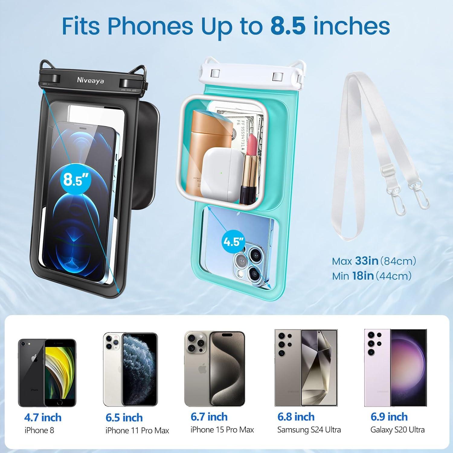 【Fits Most Cell Phones】- The water proof phone pouch iphone measures 8.5 inches and fits most cell phones with or without a case, providing double insurance for your phone. Fits large devices up to 7.5 inches, such as iPhone 16 15 14 13 12 11 XS XR X Pro Max Plus Mini, S24 S23 S22 Ultra and more.