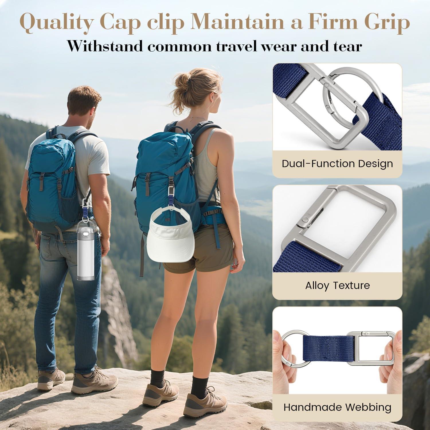 【Sturdy & Durable Hat Holder】- Baseball cap clip is designed with handmade webbing and square + round alloy clasp, easy to press and release, hat holder for bag can withstand common travel wear and tear and stress, and maintains a firm grip, the hat is not easy to fall off and within reach